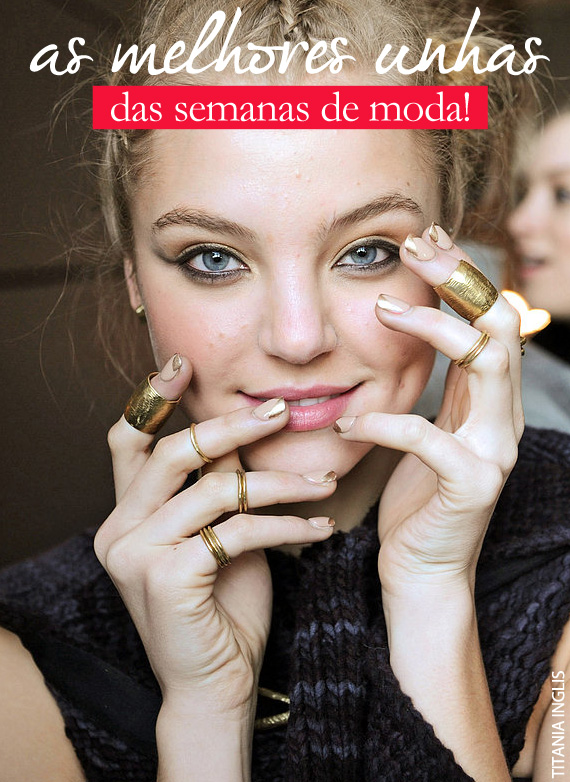 Selecionei 4 das unhas mais bonitas que vi e que são completamente “usáveis” no dia a dia para inspirar a segunda-feira! Pra começar, as unhas da Titania Inglis, lindíssimas em nude com um detalhe em “V” dourado na ponta. Amei tanto! Até quem não é muito adepta a nail art pode tentar essa, hein? Muito linda mesmo, e com esse mix de anéis da modelo ficou ainda mais lindo! #euquero
